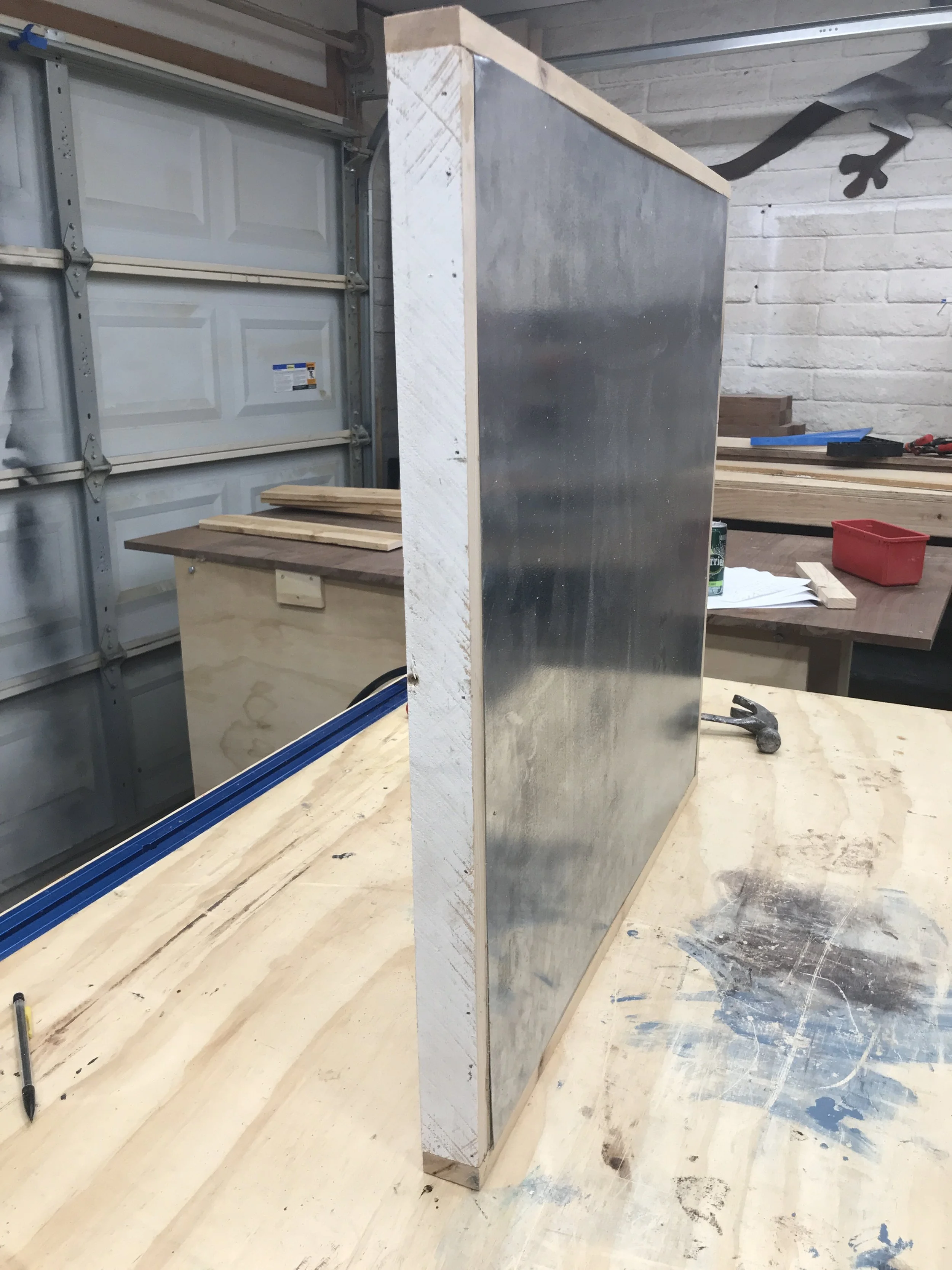 Using the contact adhesive attach the sheet metal to the 3/4” plywood backer.